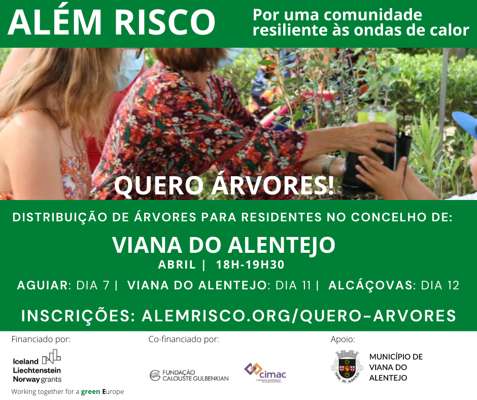 Denominada “Quero Árvores”, a iniciativa decorrerá em Aguiar, hoje, dia 7 de abril, em Viana do Alentejo, no dia 11 e, em Alcáçovas, dia 12, entre as 18h00 e as 19h30. Os interessados poderão efetuar a sua inscrição através do formulário disponível em https://alemrisco.org/quero-arvores/ .