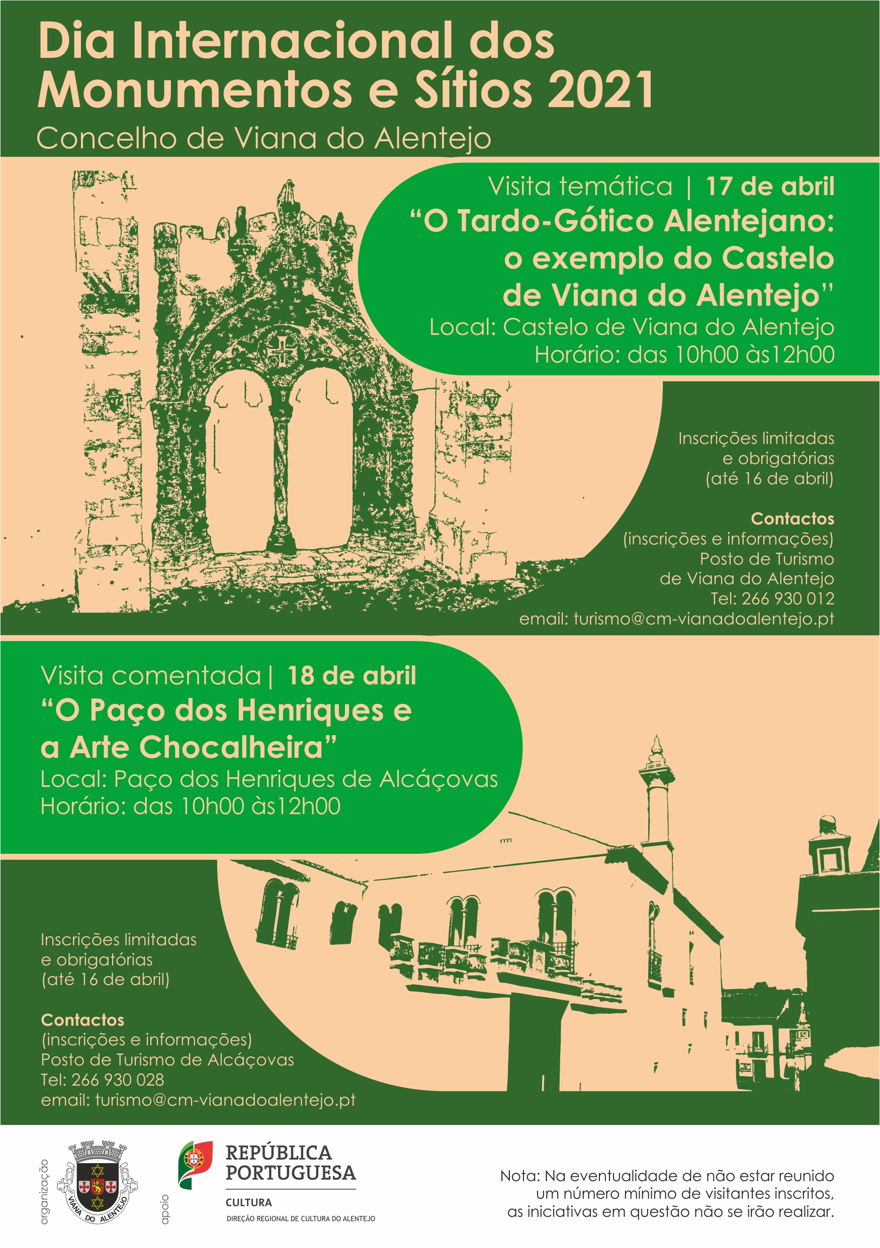 Para mais informações através dos números 266 930 012 (Posto de Turismo de Viana do Alentejo) e do 266 930 028 (Posto de Turismo de Alcáçovas), ou do endereço de email turismo@cm-vianadoalentejo.pt.