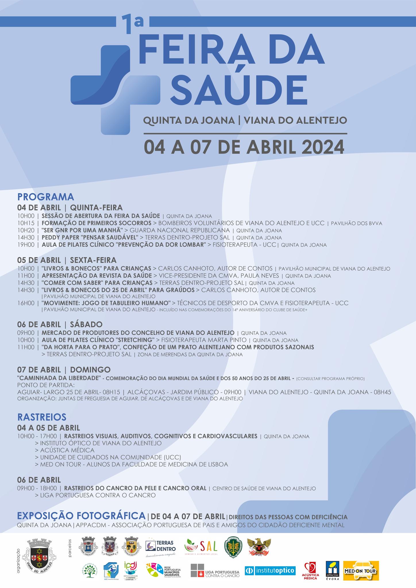 Atualizado em 21/03/2024O Município de Viana do Alentejo vai promover de 4 a 7 de abril, a Feira da Saúde, na Quinta da Joana, em Viana do Alentejo.
